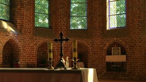 Pierwotne fragmenty ścian prezbiterium są obecnie nieotynkowane.