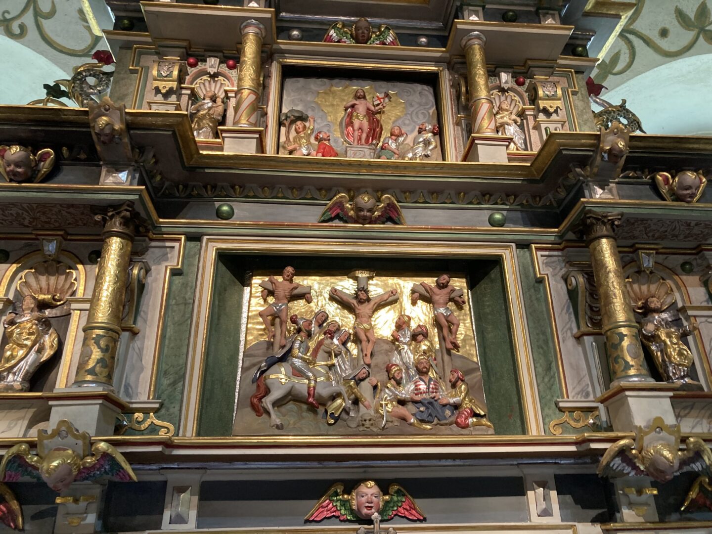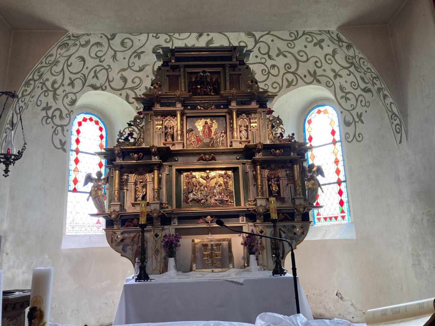 Ok. 1897 r. został zawieszony dzwon z inskrypcją w jęz.niem. (Bądź wierny aż do śmierci). Wnętrze kościoła przekryte jest drewnianym, belkowanym stropem. Wewnątrz, z renesansowego wyposażenia zachowały się: w prezbiterium czasza ambony z 1600 r. z wizerunkami czterech ewangelistów, architektoniczny renesansowy ołtarz główny z 1608 r. (odnowiony w 1988 r.). Ponadto wsparta na filarach drewniana empora organowa z 1900r., neorenesansowy prospekt organowy z 1908r., witraże i mosiężny świecznik z 1900r., barokowe epitafium z ok. 1670 r.